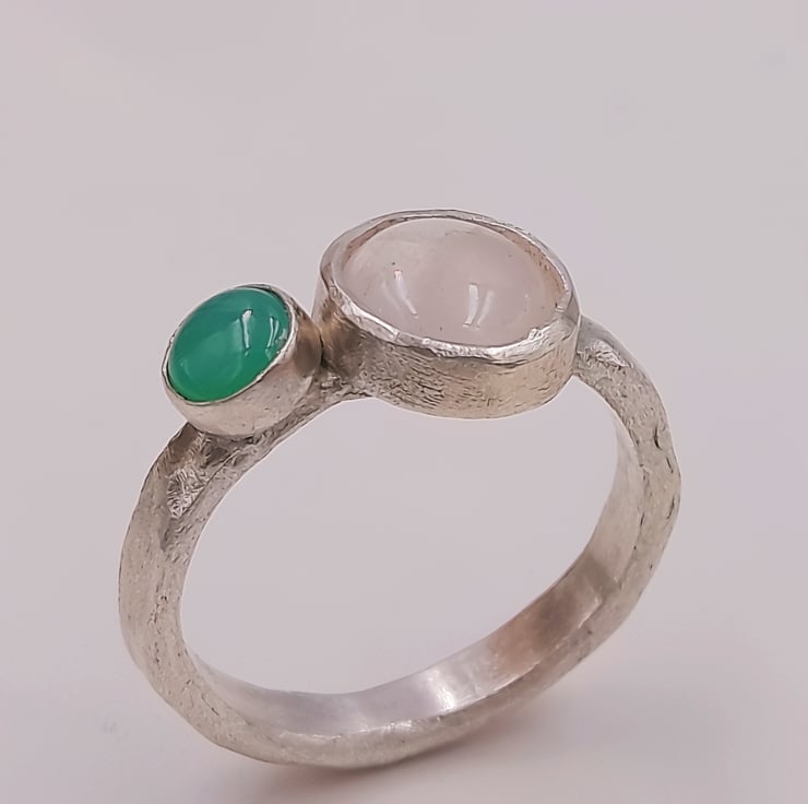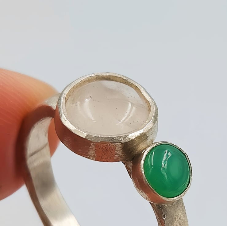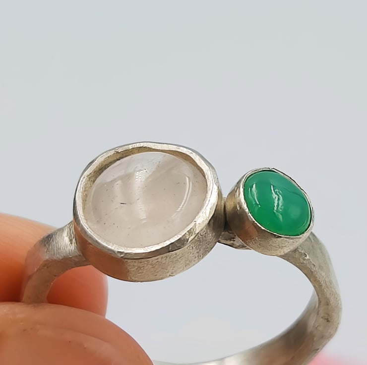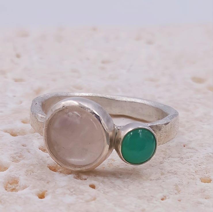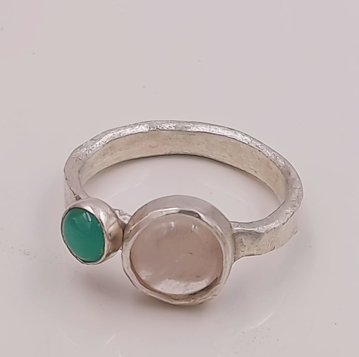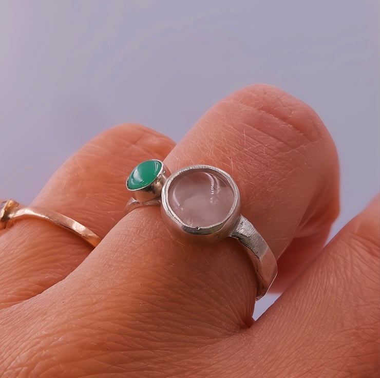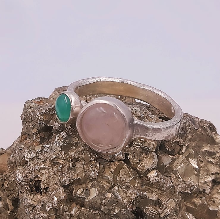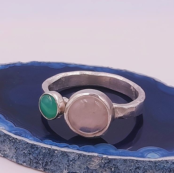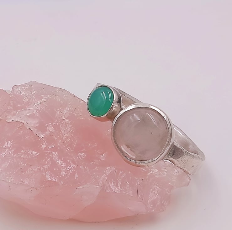Discover the harmonious beauty of the Rose quartz and Chrysoprase Double Stone Silver Ring, a stunning combination of a rose quartz and chrysoprase cabochon set within a sterling silver band.