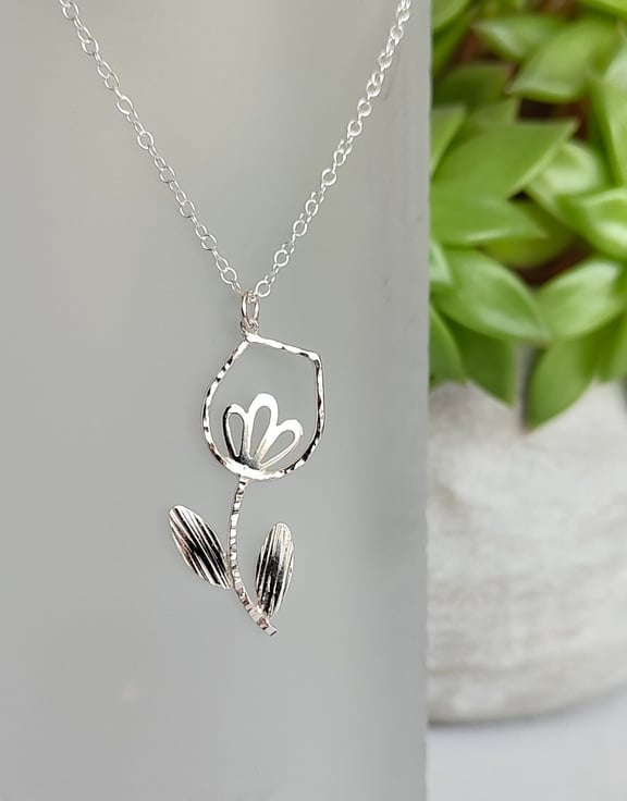 This delicate sterling silver tulip pendant is handmade by forming wire and saw piercing sheet silver. I add texture with a ball hammer and riveting hammer and a jeweller's saw, making every piece unique. This beautiful floral pendant hangs from a gorgeous trace chain, please choose the length required, 40cm (16") or 45cm (18)".