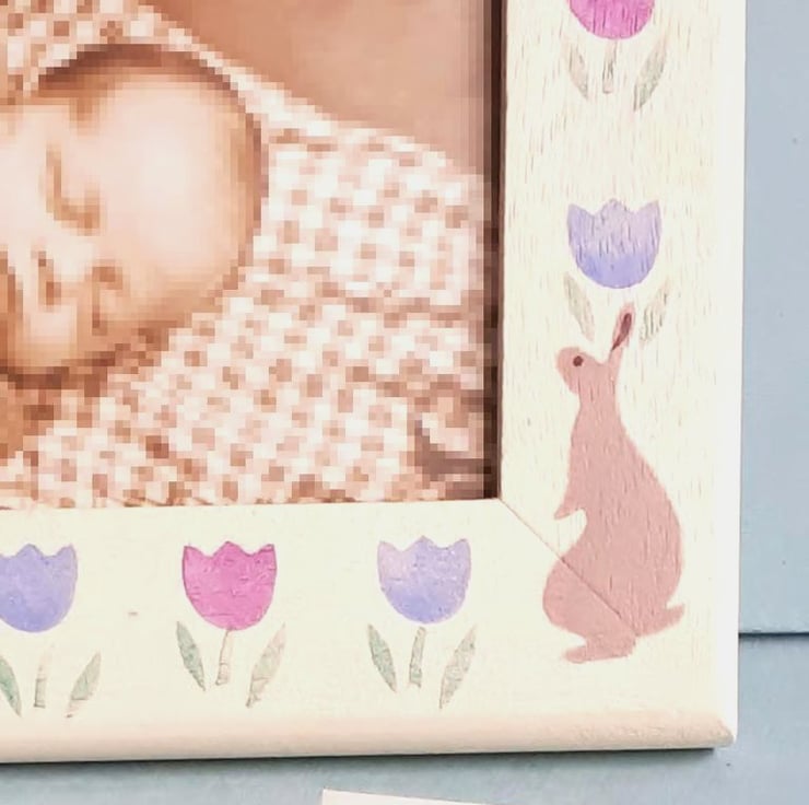 This photo-frame is hand painted with adorable rabbits on a background of tulips.
