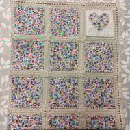 Handmade, cotton patchwork baby blanket with crochet edging.