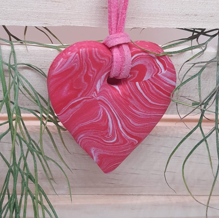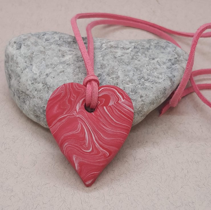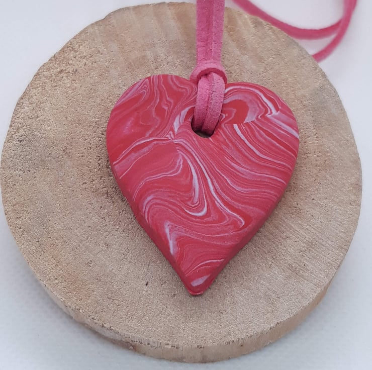 A brightly coloured heart shaped pendant featuring dark pink and white polymer clay in a unique swirl design