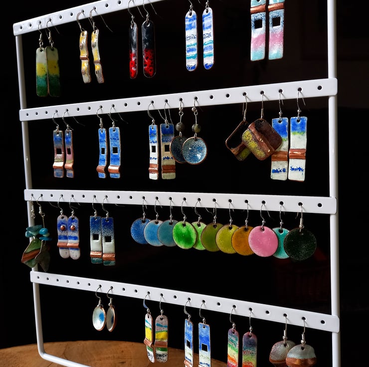 Backing of glass enamel with attached silver plated ear hooks.