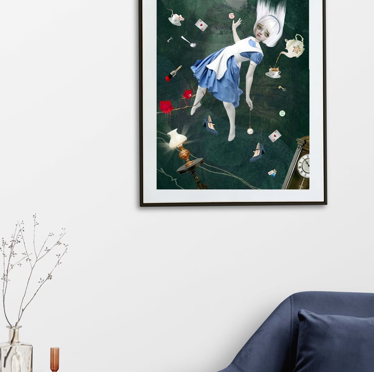 In this fairytale art print, Alice tumbles headfirst down the rabbit hole, her world a whirlwind of whimsical colors and shapes. The scene captures the thrill and curiosity of her unexpected journey into the fantastical realm of Wonderland.
