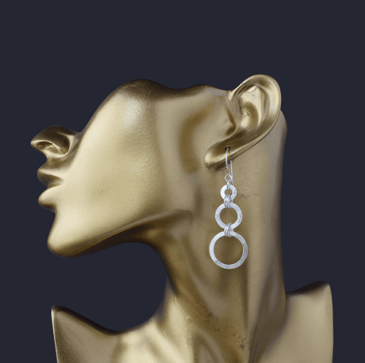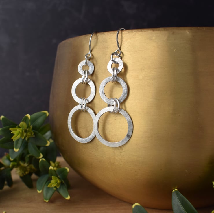 Textured sterling silver dangle earrings featuring a geometric design of three open circles of increasing size. Hung from handcrafted ear wires.