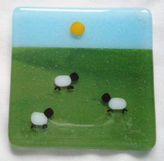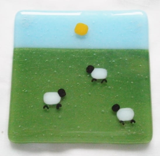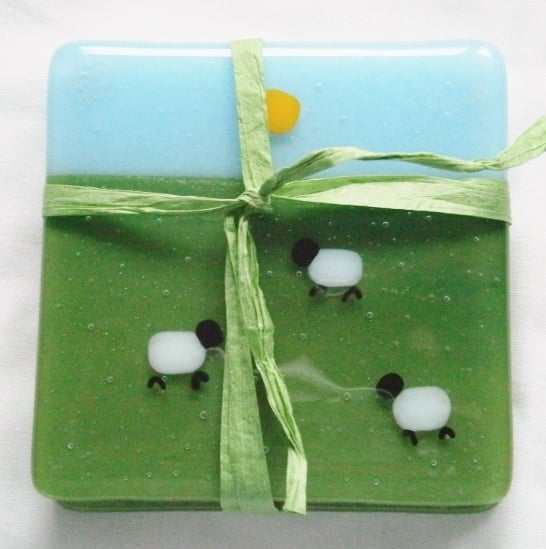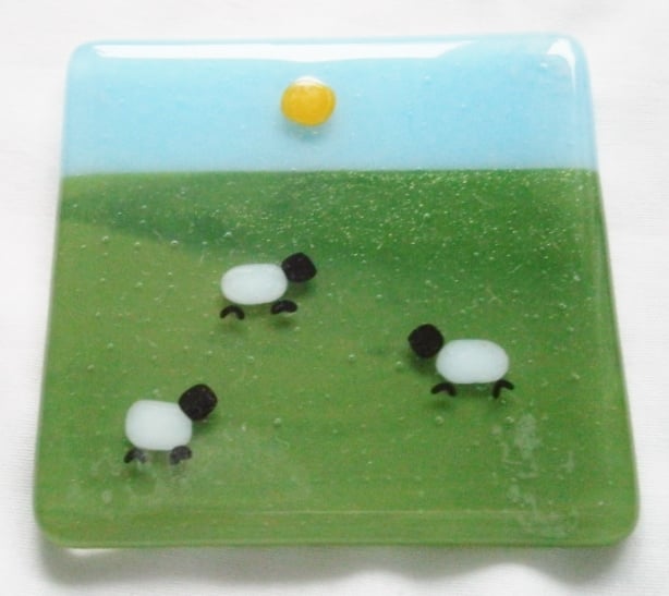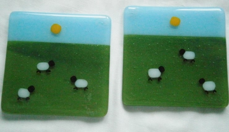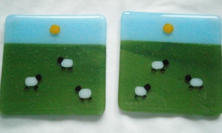 A pair of handmade fused glass sheepy coasters with 3 sheep on each and a bright yellow sun.