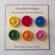 I made this long necklace using two textile techniques. The pendant consists of two Dorset buttons worked in green and purple cotton thread on metal rings, embellished with multicolour beads and a ring covered in the purple thread. I made the braid from which the pendant hangs using the Japanese Kumihimo braiding technique, using the same colours of cotton thread. There is no fastening as the necklace is designed to simply pass over the head. I have used a nickel-free silver plated cord end to attach the braid to the top button.