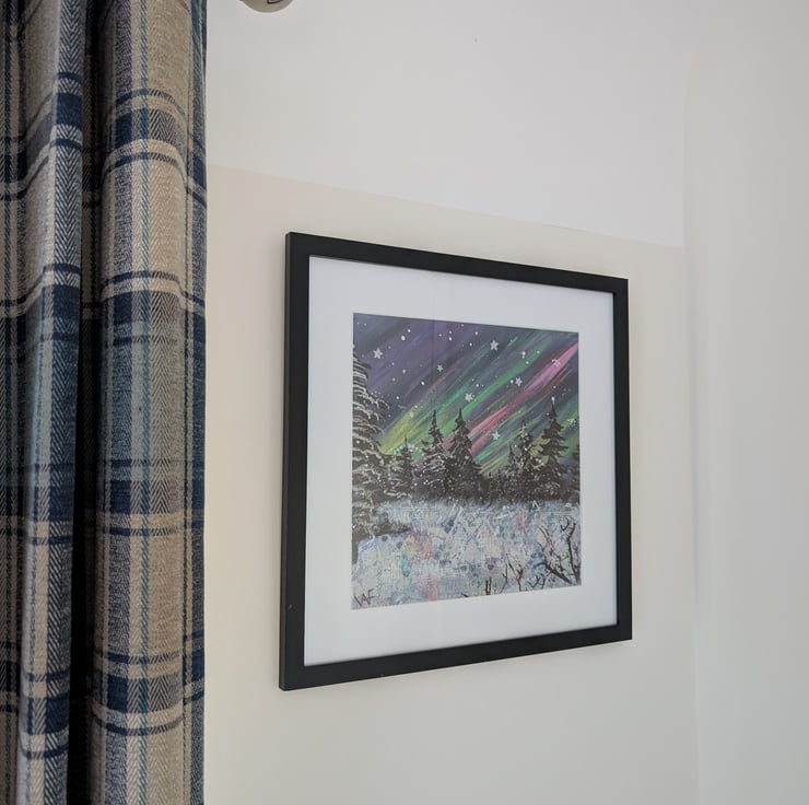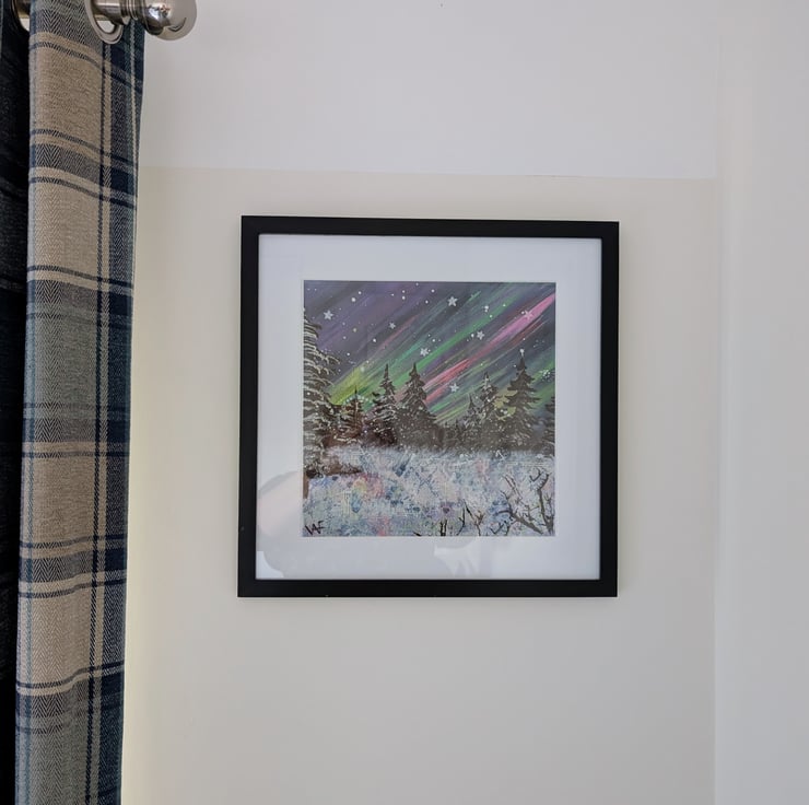 The Northern Lights always fascinate me, nature’s light show is amazing. Here in the UK we have been lucky enough to see them recently and yet despite visits to Scandinavia, I have yet to see them in action, but long for the night I do. In the meantime I dream and create an inspired version within my art, often coupled with snow, mountains and woodlands.