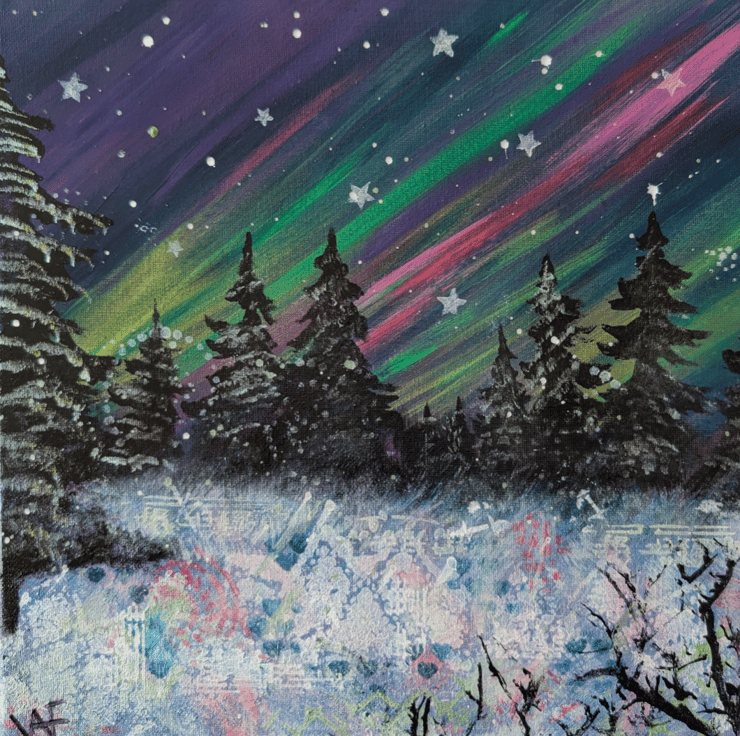 This a print of my original painting "The Party". The image captures the notion of the party season within a winter scene. Snow dusted trees silhouette the aurora borealis which lights up the sky and puts on a show for its audience. The textured-looking snow picks up the colours from the night sky.