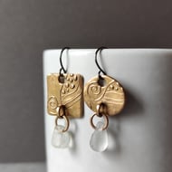 Small dangly seaglass earrings made from white bronze metal clay, 3 cms from hook to base. The earrings are textured front and back using lino-cutting techniques, the patina highlights the raised lines. The fittings are surgical steel- email me if you would prefer sterling silver.