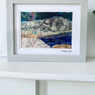 The embroidery measures 11x16 cms. In it’s repurposed frame it is 18.5x23.5cm It can hang or stand on a shelf. There is no glass in the frame which allows the textures to be fully appreciated.