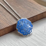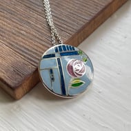 I'm really pleased with how this pendant has turned out. It has a base of fine silver with fun 'bubble' texture on the reverse and pretty bail. The enamel on the front uses just 2 enamel colours, but by layering differently it almost looks as if many more tones have been used, with swirls used to separate the colours incorporating the cloisonné enamel technique. It comes hanging from an 18inch sterling silver chain.