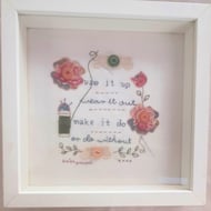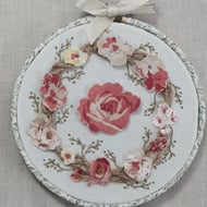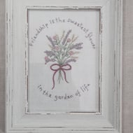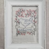 More than a card! Hand embroidered on vintage linen and mounted on a piece of vintage manuscript on a blank card for your own message. Ideal for when you want to give more than a card as this beautiful card can be framed afterwards.