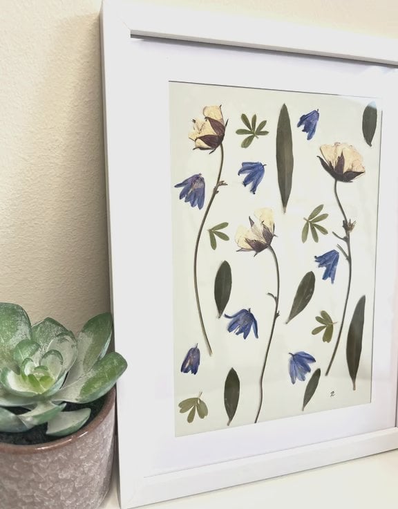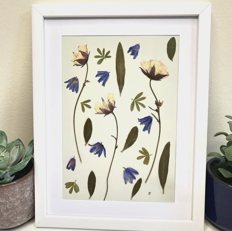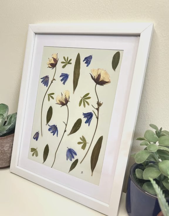 Bring nature indoors with this unique pressed flower and foliage framed art. Geums, bluebells, olive leaves and potentilla leaves all grown in our garden in Hampshire and traditionally slow pressed.