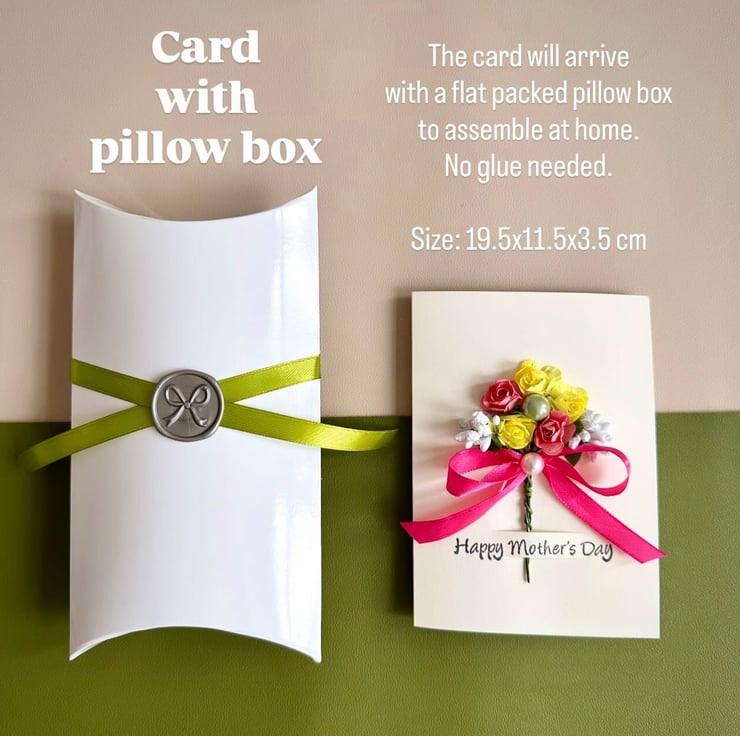 As standard your card will come blank in a glossy white pillow box with ribbon and wax seal stamp sticker for you to assembled at home to make it unique present.