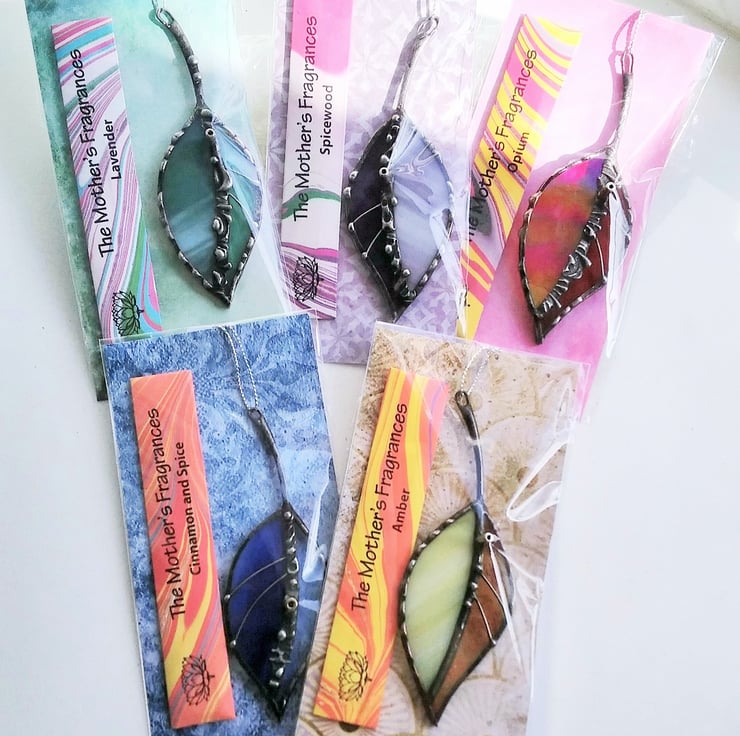 Colourful leaf-shaped incense burner hand crafted from wispy/iridised/textured stained glass and finished with decorative solderwork details in a brushed pewter patina. Includes a pack of mini organic incense sticks from Mother's Earth (cruelty-free; vegan).