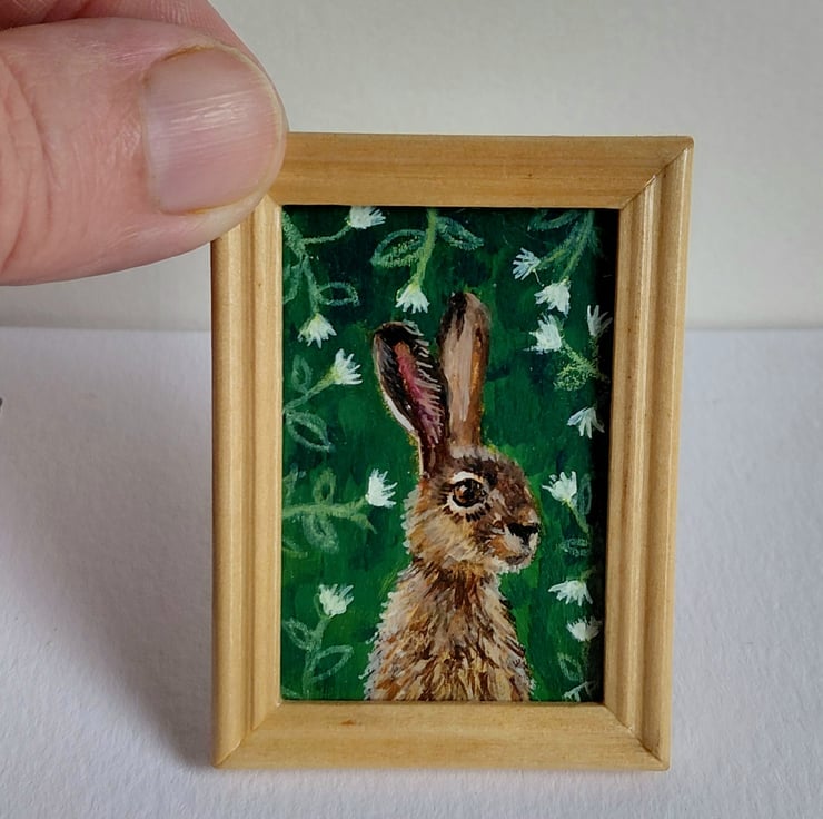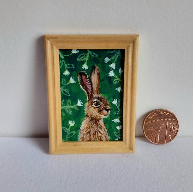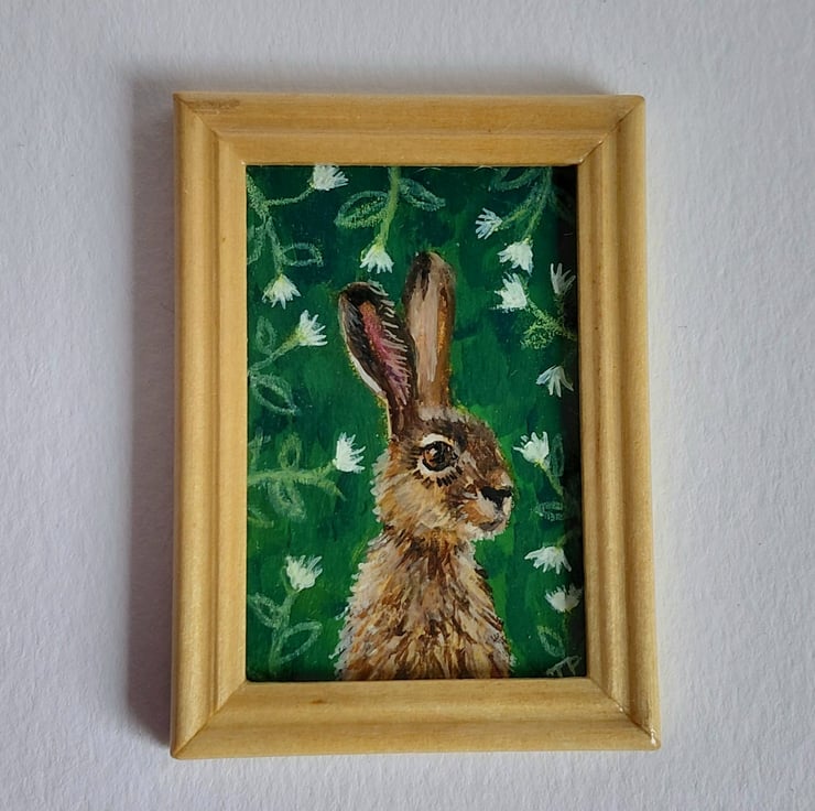 An original oil painting 'Hare Amongst the Flowers' Miniature Painted by Traceyann Papworth.