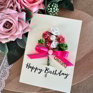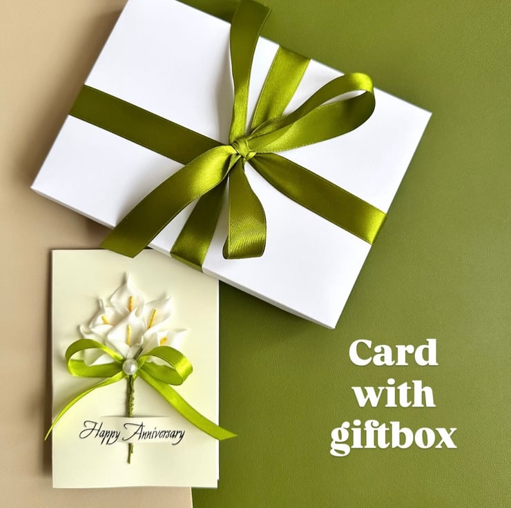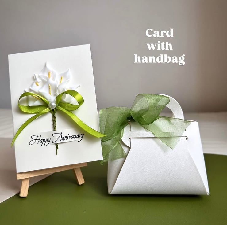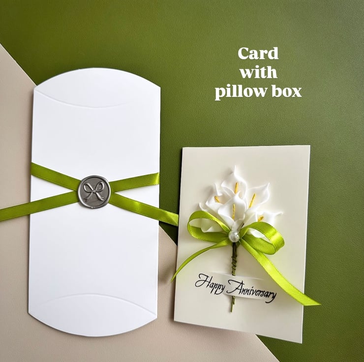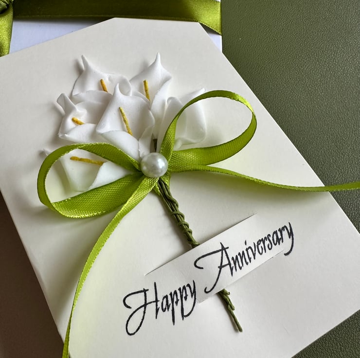 Celebrate a special milestone with this handmade anniversary card featuring a charming floral bouquet, accented with white calla lilies and tied together with a vibrant moss green ribbon.