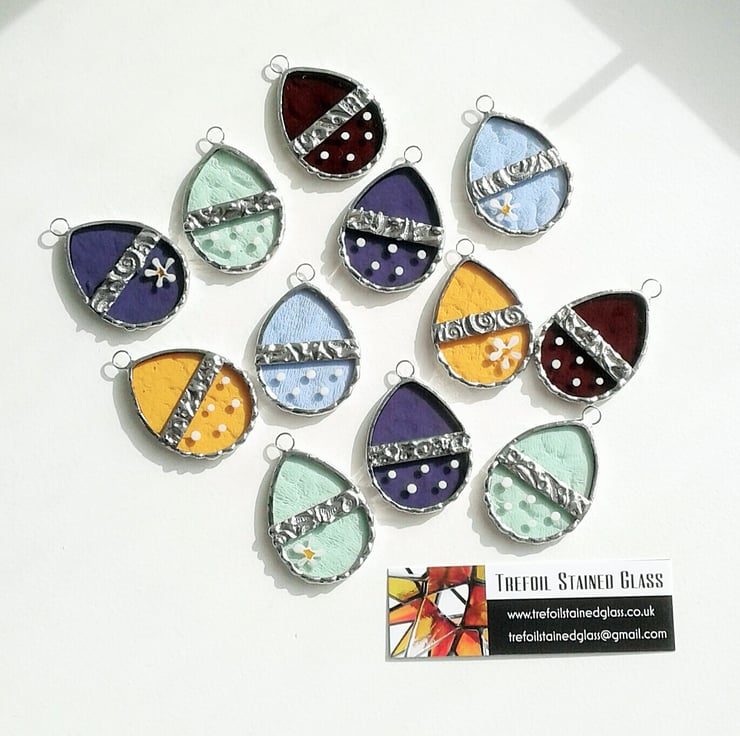 4" note card each adorned with a miniature glass Easter egg to remove and keep. Each egg is handcrafted from delicate corella stained glass in pastel hues and finished with polished decorative solder and enamel work. Every egg is unique!