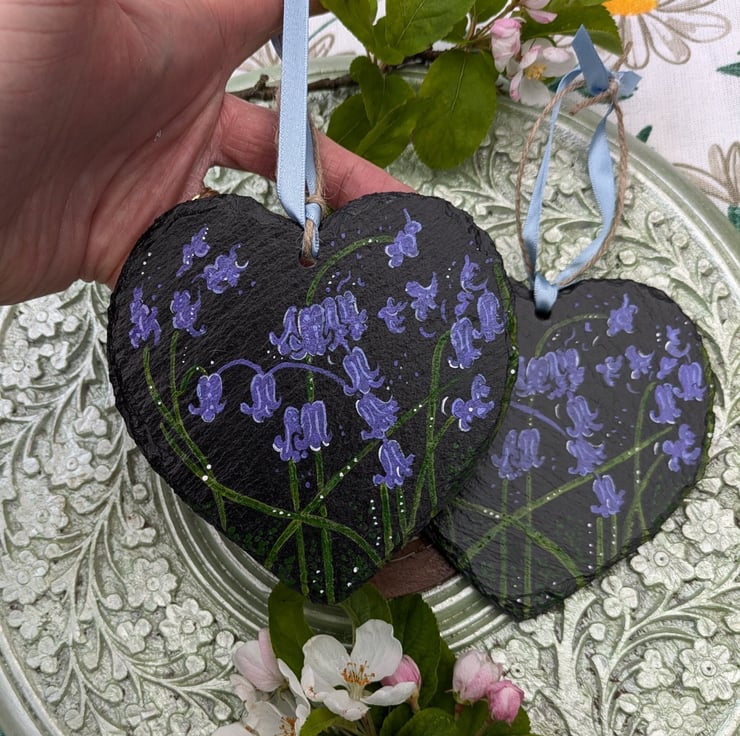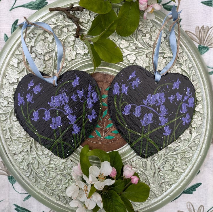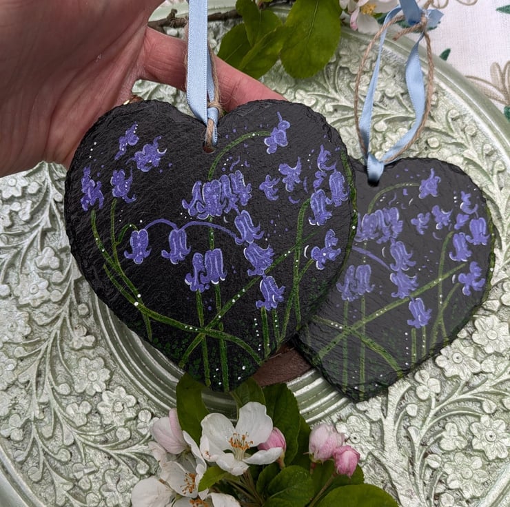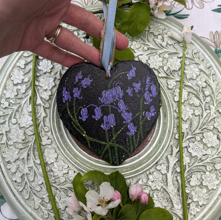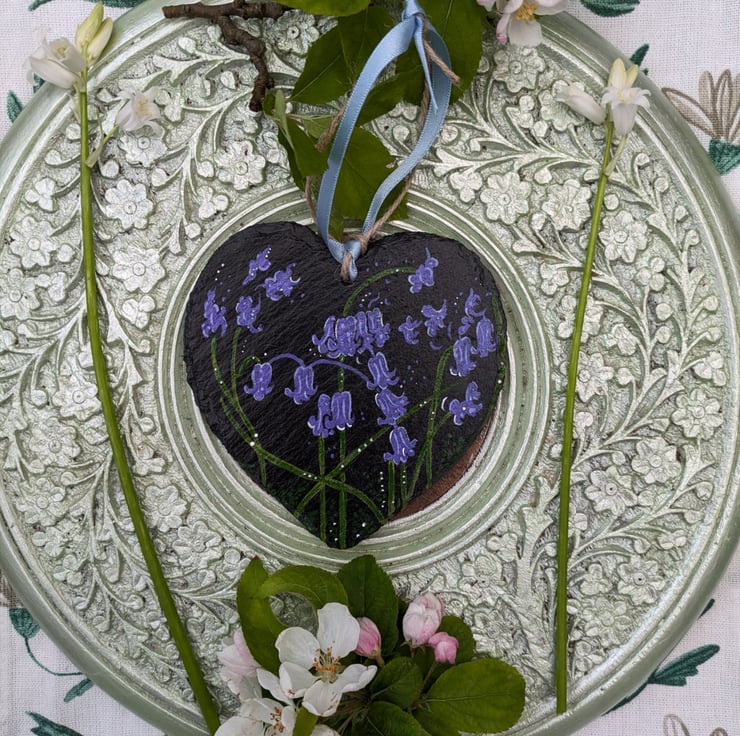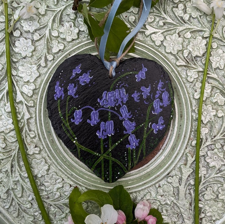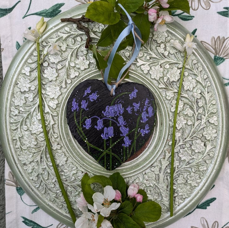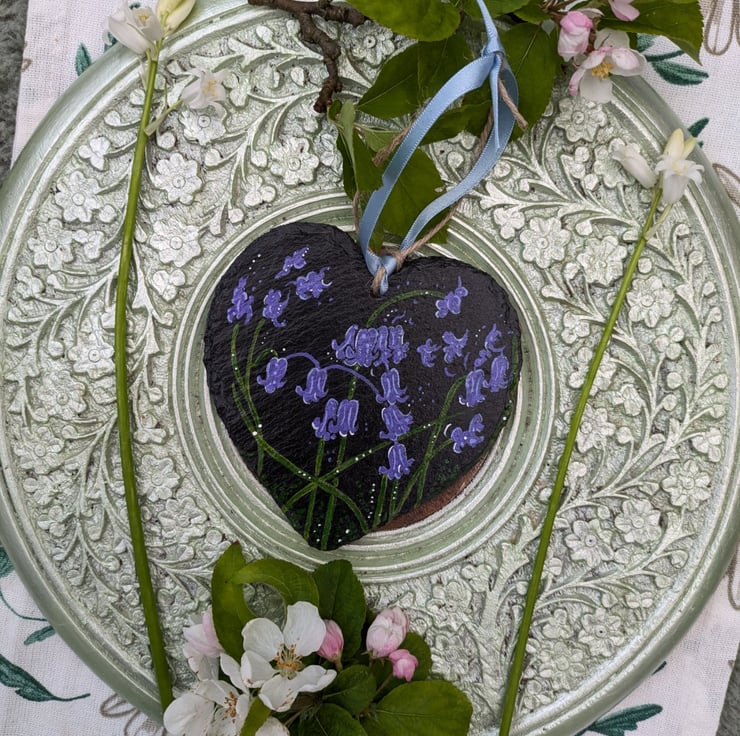 A beautiful hand-painted bluebell slate heart ornament. Lovingly hand-painted in acrylics and varnished with a gloss varnish.