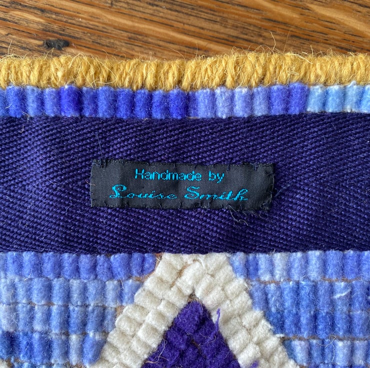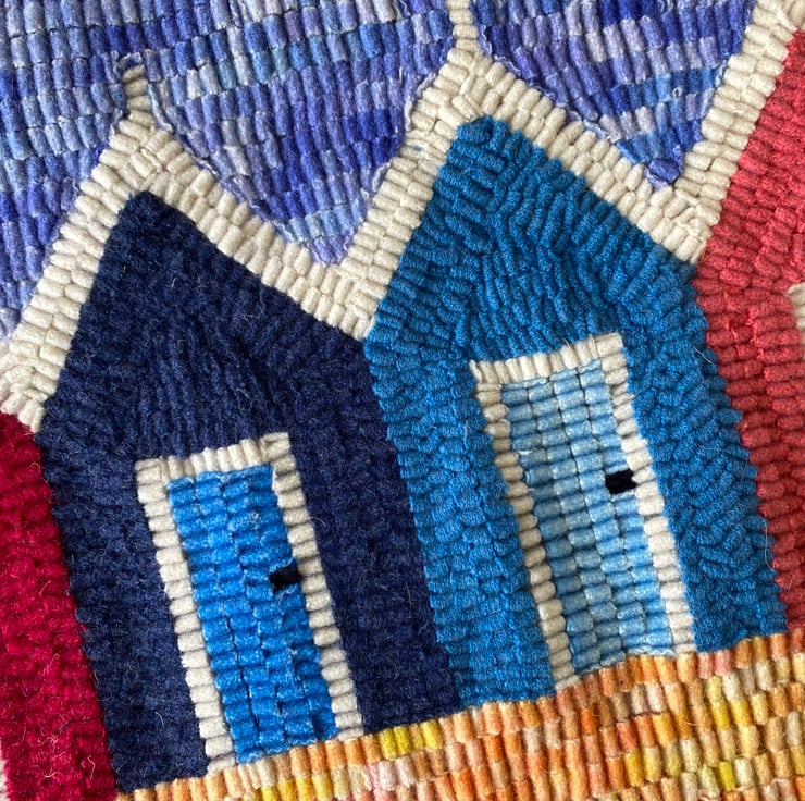 The piece is created using a traditional rug making technique known as ‘Hooky’ in the North East of England. Strips of wool are hooked through a hessian base to produce a vibrant and colourful hanging. The hand whipped edge provides a neat and robust finish.