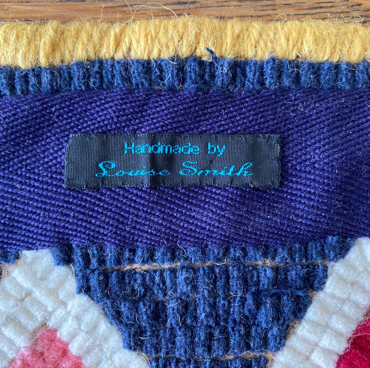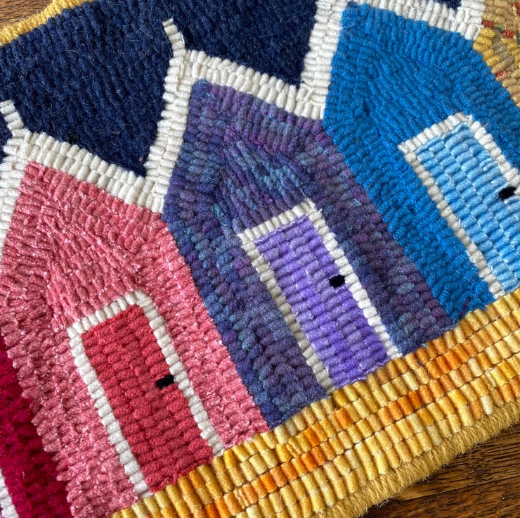 The piece is created using a traditional rug making technique known as ‘Hooky’ in the North East of England. Strips of wool are hooked through a hessian base to produce a vibrant and colourful hanging. The hand whipped edge provides a neat and robust finish.