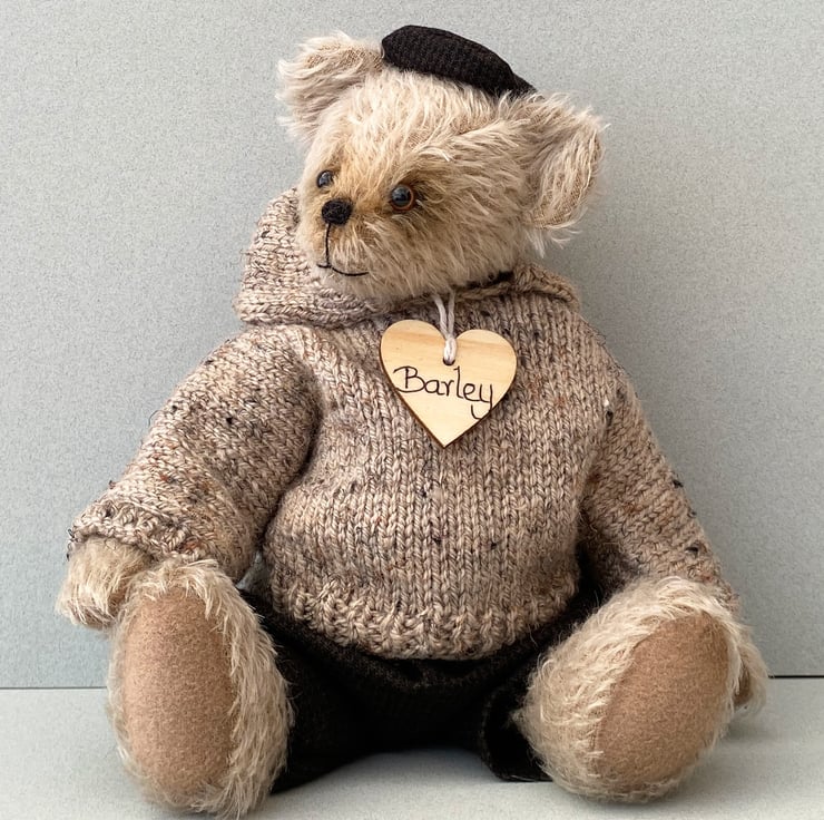 Barley wears his name on a wooden tag and Bearlescent is to the back of one ear on a polymer clay button He has been added to my bear register and will arrive with birth certificate.