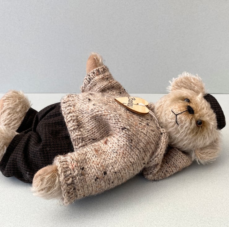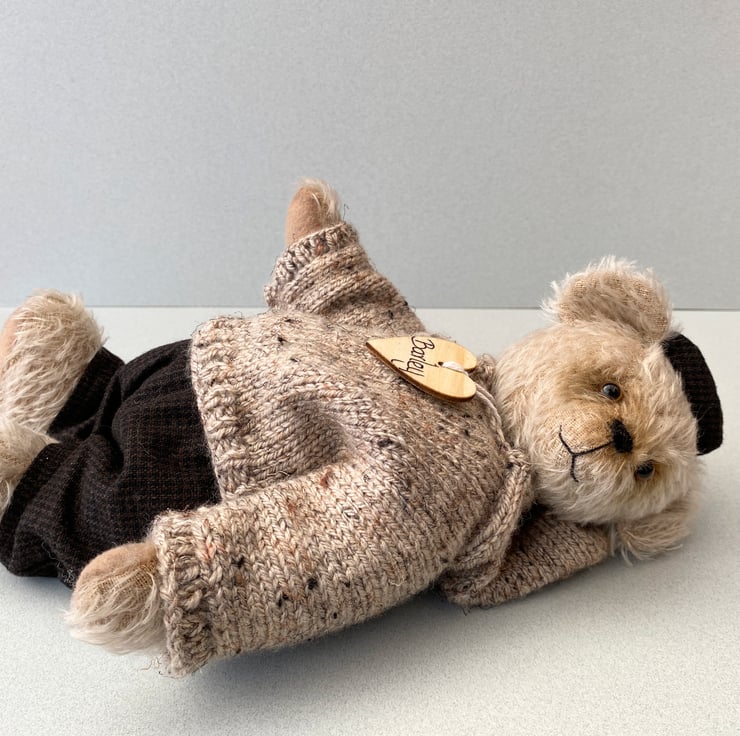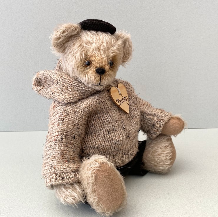 Barley is a traditional style collectable bear standing around 10.5" tall and handmade from Helmbold 12mm semi sparse mohair in Pebble.
