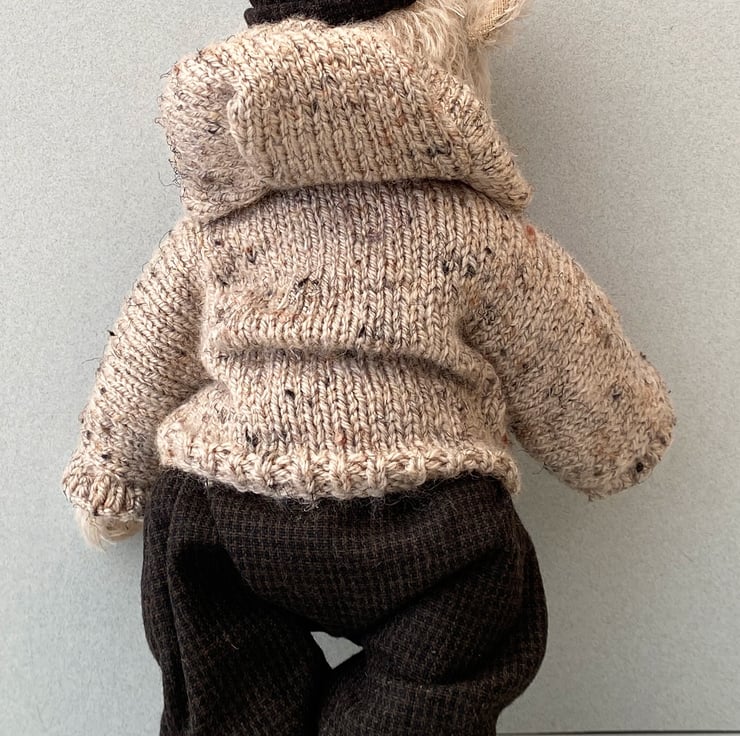 He wears a hand knitted hooded sweater in a lovely tweed wool mix yarn in beige/fawn with flecks of black. Black and brown tiny check trousers in a wool mix fabric and a matching cap which sits between his ears.