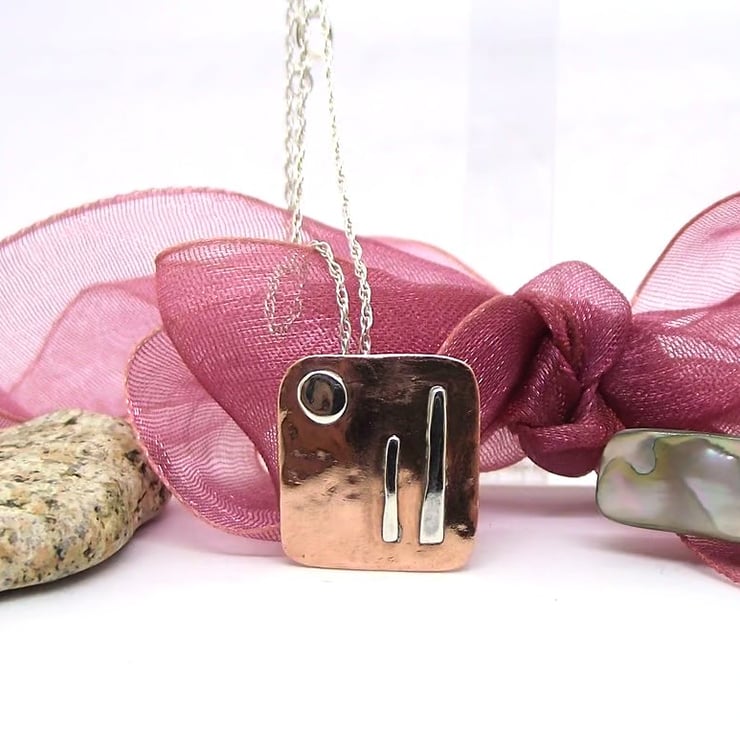 Sterling Silver and copper handmade pendant necklace. Copper square, lightly hammered, with Sterling Silver moon and standing stones decoration. Made from copper sheet that has been shaped and lightly hammered, with hand sawn Standing Stones and punched Moon motifs soldered onto the copper. Hand polished to a brilliant shine. Pendant threaded onto a 18 inch Sterling Silver fine rope chain with bolt ring clasp. Pendant size 16mm.