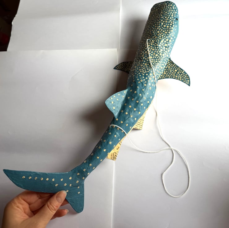 Your whale shark will be lovingly handmade from vintage book pages and handpainted in blue acrylic paint, so that all the spots on it's back are book pages with exposed lettering