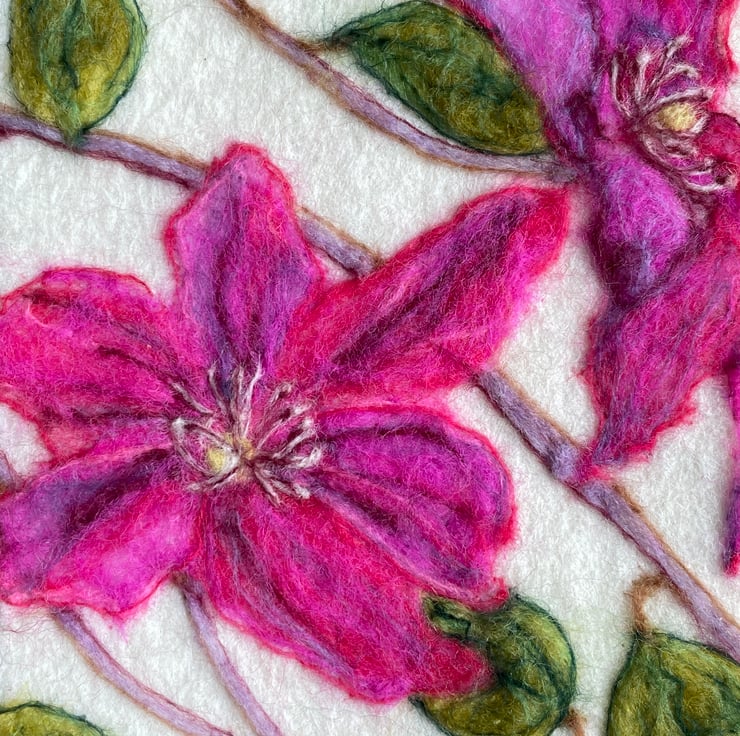 This unique textile piece captures the joyful beauty of summer, with a clematis created using the needle felting technique. The flowers are ‘painted’ with wool, felted into a natural wool base and detail is added using the felting process to bring out their movement and colour.