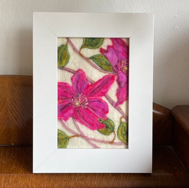 This clematis felted art work has been inspired by the wildlife, landscape and domestic gardens around the UK. This clematis piece celebrates the colours of mid summer flowers with its bold shades of pink.