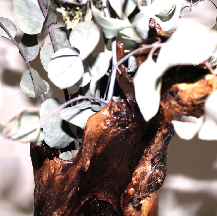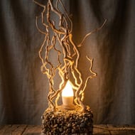 Natural driftwood table lamp with dried flower holder - a unique floor lamp that combines rustic design with soft floral charm. The open wooden cavity serves as a built-in lampshade for a floor lamp look. Includes an E27 (standard size) socket, compatible with LED bulbs. Soft ambient lighting, ideal for cozy, nature-inspired spaces. A sculptural floral alternative to a lampshade with character and warmth.