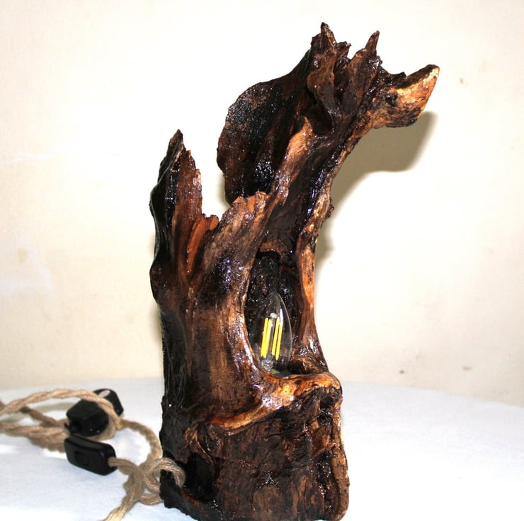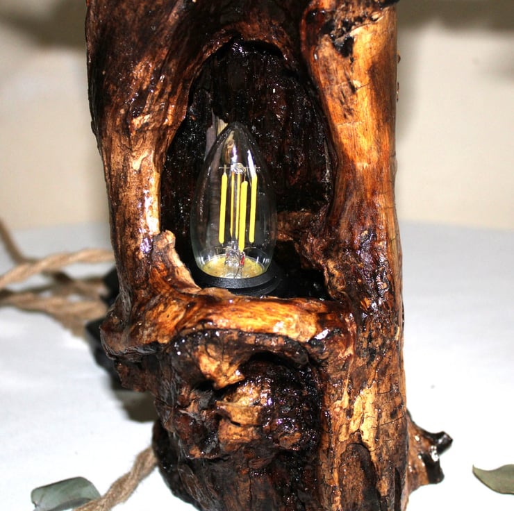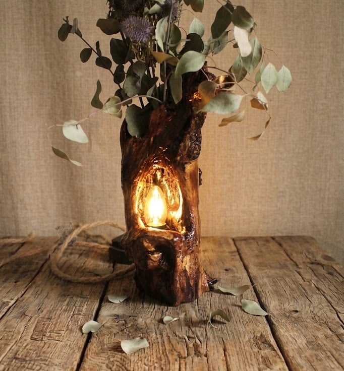 Walking in nature, I found this beautiful piece of wood. I saw the beauty in it first for a vase for artificial flowers, and later for a lamp hole! The wood required time to dry, process, and finally seal with varnish and install the lamp! It turned out to be a very nice piece of wood!