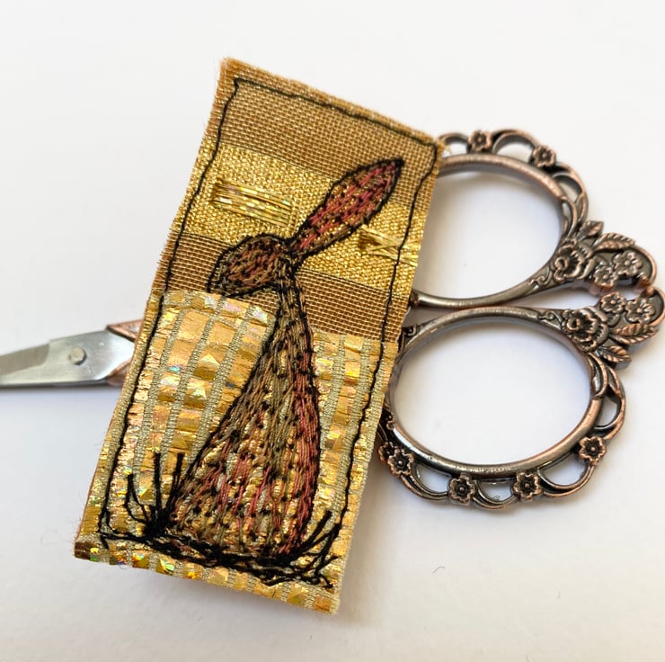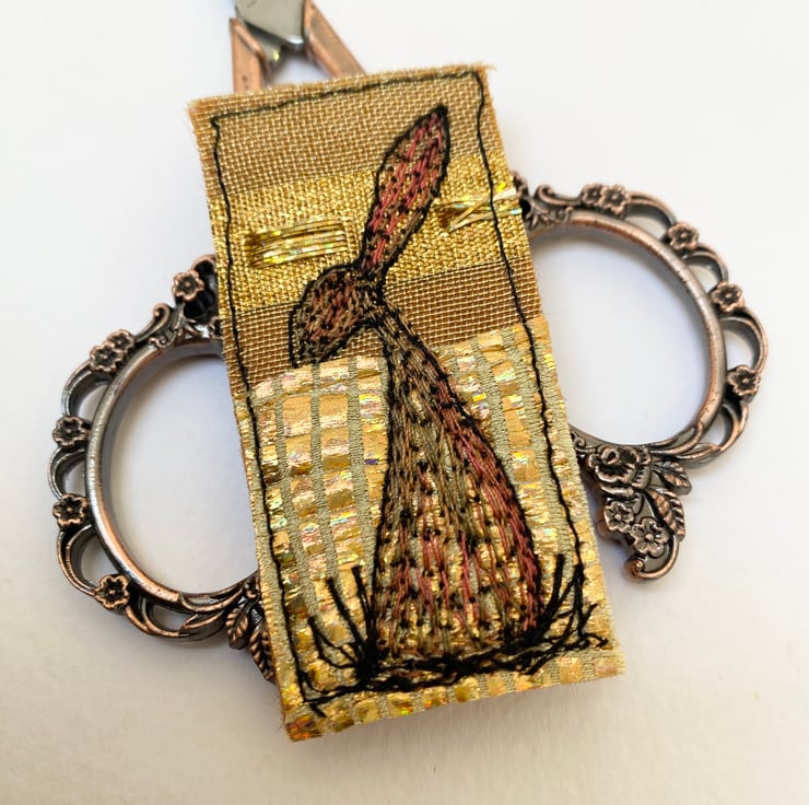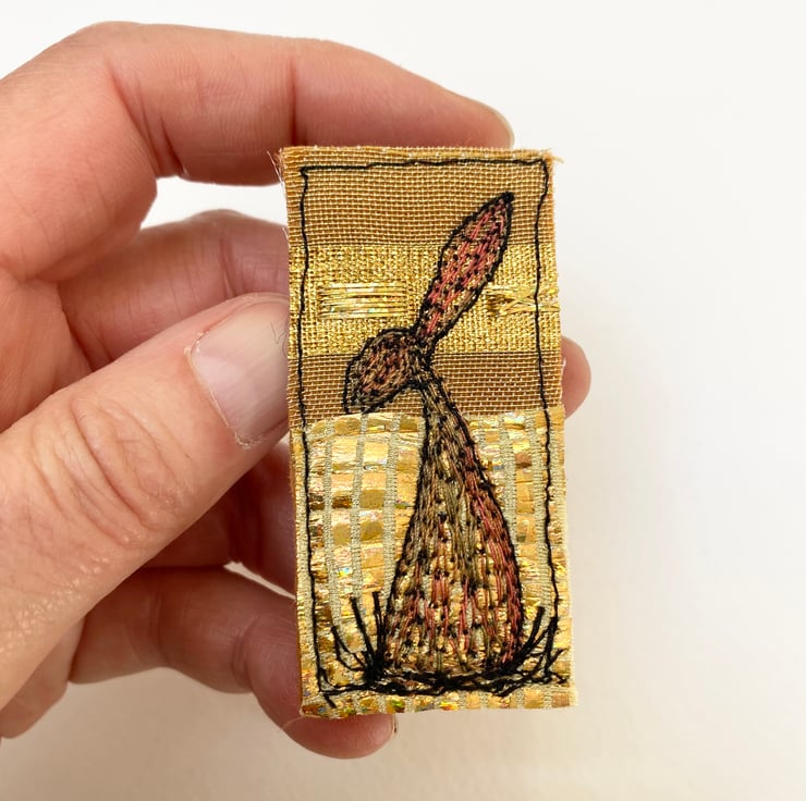 This charming handmade free motion embroidered golden hare brooch is made from up-cycled fabric. It is felt backed, and has a brooch pin with hook on the reverse to keep it nice and secure. It measures 3 x 6cm approx. The designs are similar.
