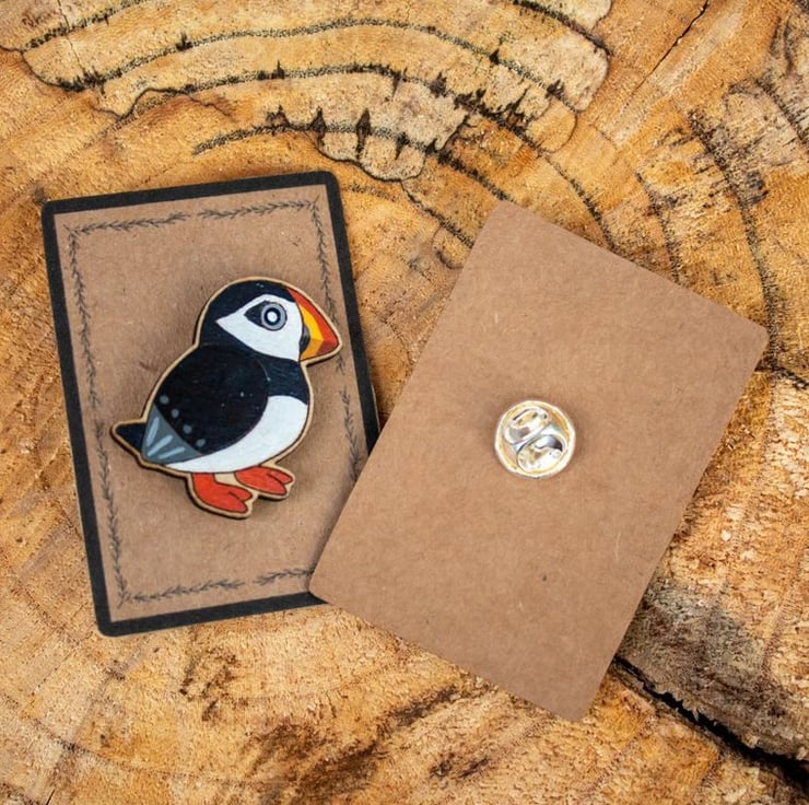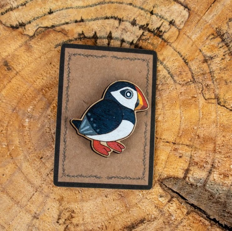 A cheerful touch of island magic comes to life in this hand painted wooden puffin pin. Each piece is laser cut from eco friendly plywood and individually painted by hand, capturing the puffin's bold black and white plumage, bright bill and endearing, slightly comical character in a small, wearable keepsake.