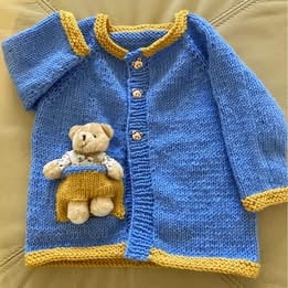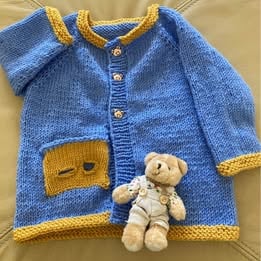 Blue boys cardigan trimmed with gold and fastening with 3 teddy face buttons. The cardigan has a little pouch where a small boy teddy can be kept safe.