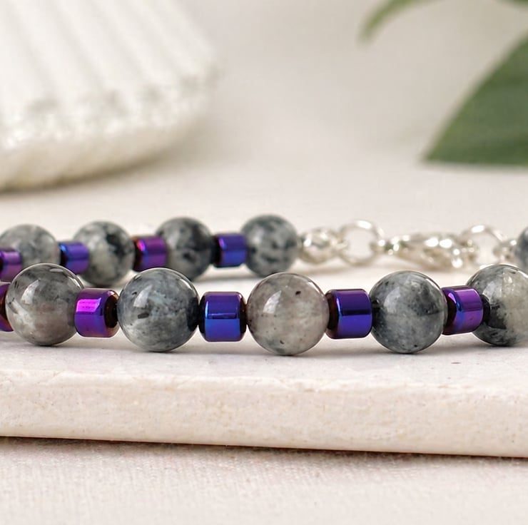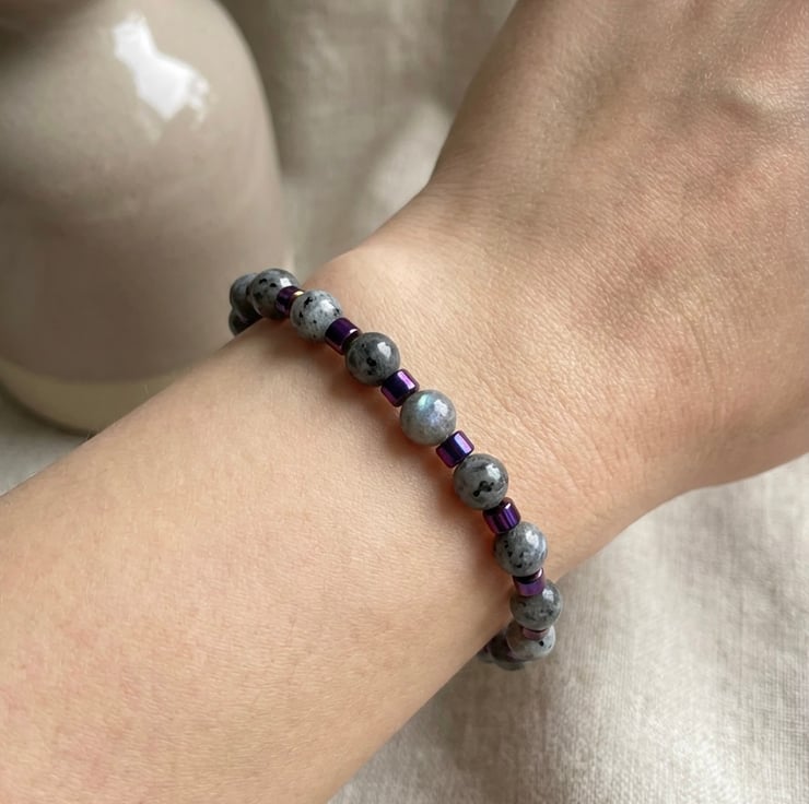 This gorgeous simple but stylish bracelet has been lovingly handmade using 6mm Grey Labradorite gemstone beads accented with colourful 4mm plated Purple hematite drum beads that really make the colour inclusions of the labradorite stand out beautifully, made to fit a 7.5 inch wrist, this bracelet fastens with a silver plated lobster clasp, I can custom make a different size or make one that is elasticated, please send me an email, I will post this out gift wrapped in Tissue and a pretty organza bag, already for you to gift,