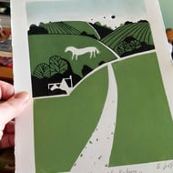 After drawing each piece, I carefully hand carve the lino plate. I mix all my colours by hand from professional water based printing inks and the lino blocks are then inked and put it into my printing press. Lastly I print them individually straight onto high quality printing paper. If there is more than one colour involved in a design this process is then repeated.