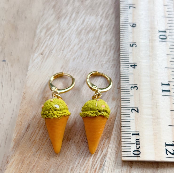 Nothing says summer like a melting ice cream cone! I created these pistachio treats to bring a bit of holiday joy to your everyday outfit. I wanted to design something that feels like a sunny afternoon at the seaside-fun, refreshing, and guaranteed to make people smile. Every cone is individually hand-sculpted in my small UK studio, making your pair truly one-of-a-kind.