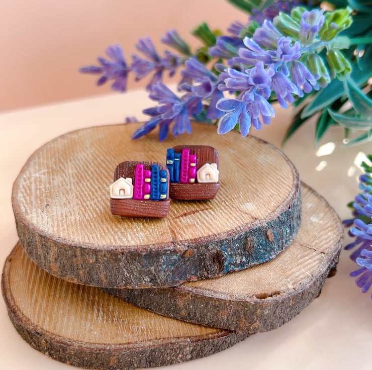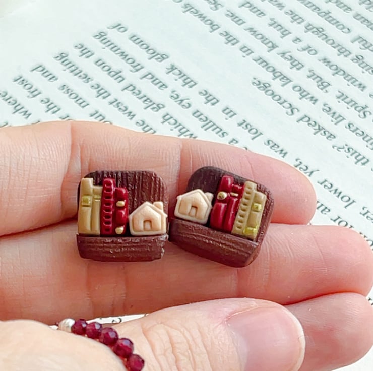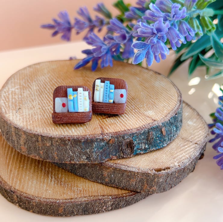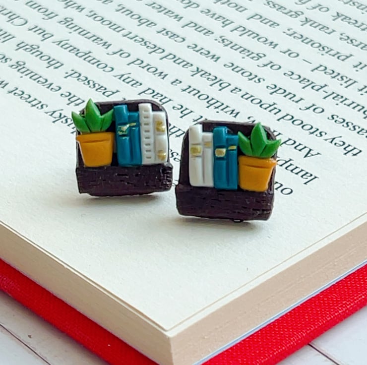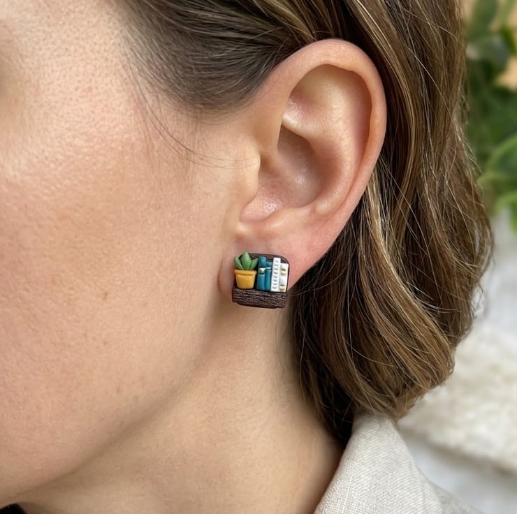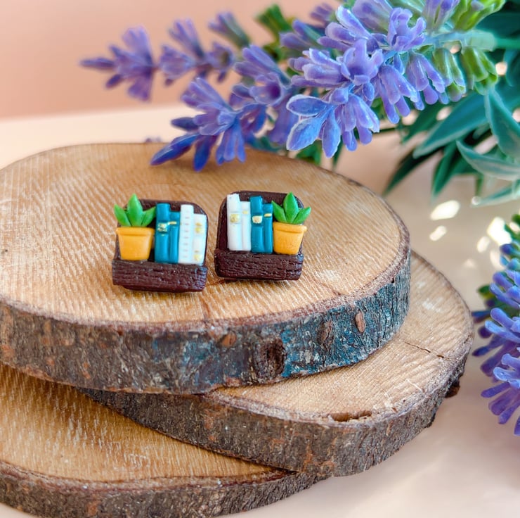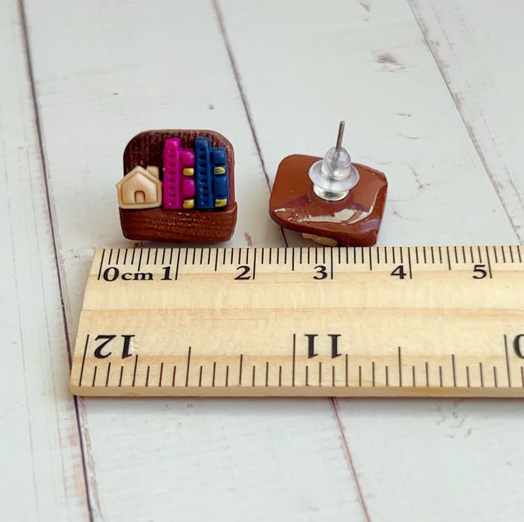 Handmade bookshelf stud earrings for book lovers, hypoallergenic posts. 4 library styles. Perfect gift for bookworms. FREE UK Delivery.