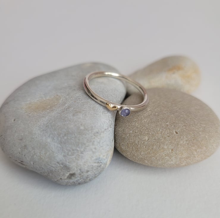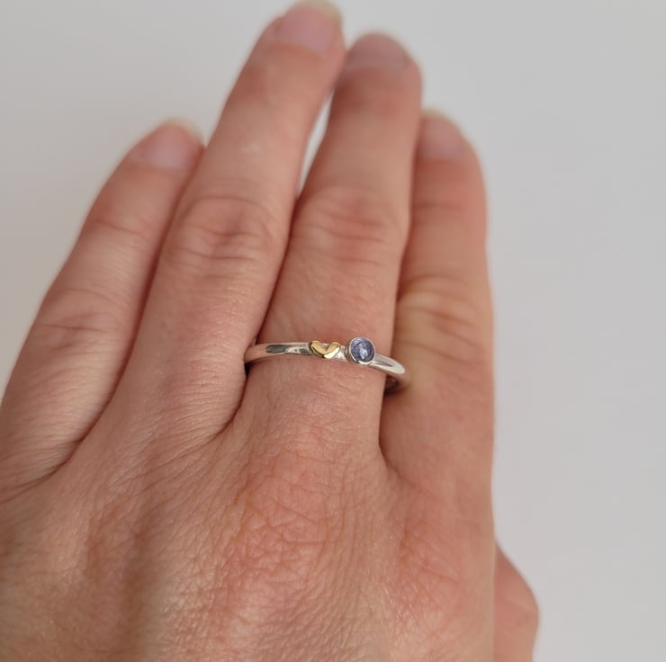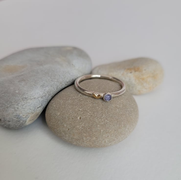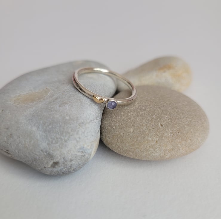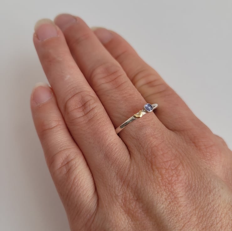 A beautiful blue-violet tanzanite semi-precious stone has been set in a handmade recycled sterling silver ring. Next to the stone sits a recycled 9ct yellow gold heart.