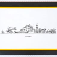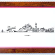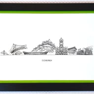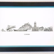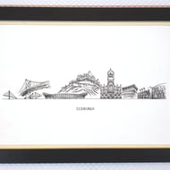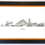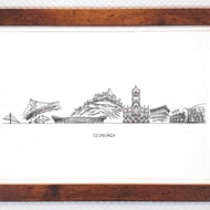 Framed high-quality shaded A3(42cm x 30cm) landscape Giclee print of a Glasgow Cityscape/Skyline. The original artwork was created from scratch, firstly by sketching out in pencel each building. After outlining the pencil work using different thicknesses of Faber-Castell and Staedtler black pigment liners each building was then shaded using the Winson and Newton promarker grey/neutral tone set. The print comes finished with a thin stylish dark green border(see shop page for all other border colours). Framed with an expensive Styrene Protective Perspex (which has same clarity of glass) ready to hang. Buyer can choose from three types of frame; Black, Oak or Dark Oak. Shades/tones of print may differ slightly due to computer/phone settings. All purchases delivered within 7-10 working days.
