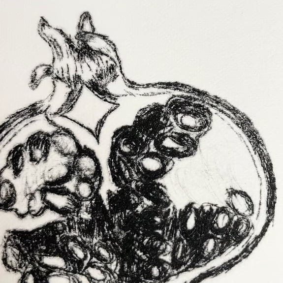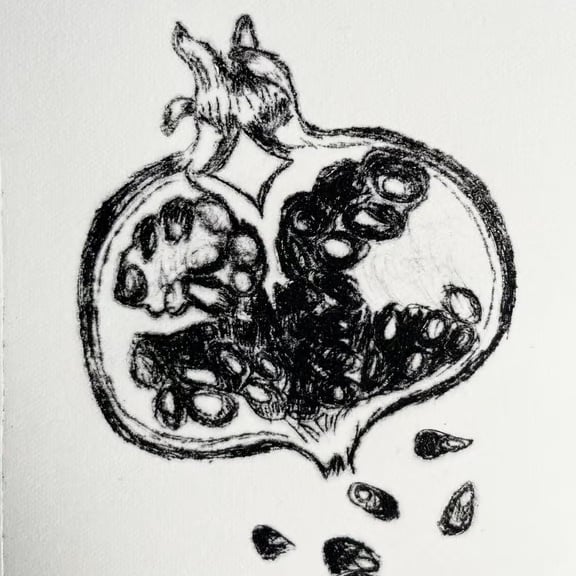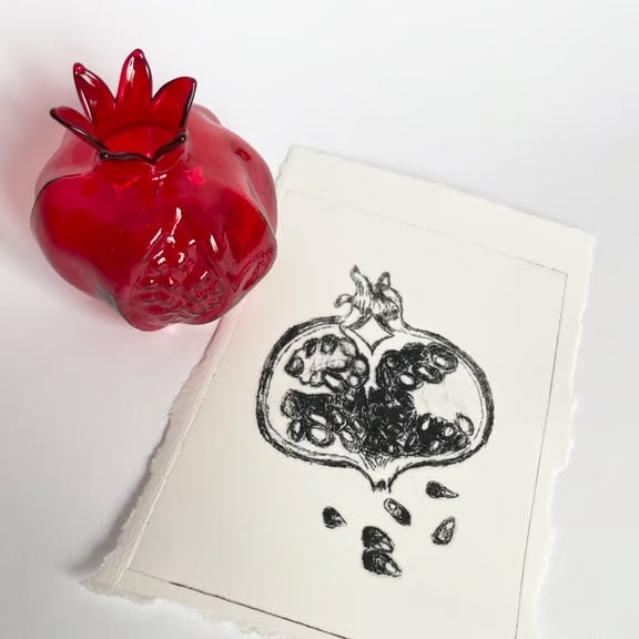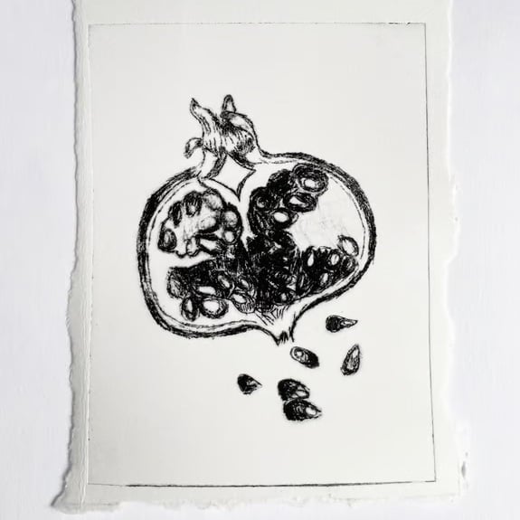 This is a black pomegranate illustration printed using the drypoint technique. The image depicts the inside of a pomegranate with some pomegranate seeds spilling out below. It is printed on an off white 285g Fabriano paper. The edges of the paper are hand torn. A6 size /15cm x 10cm / 6 inch x 4 inch. (Approximate measurements)