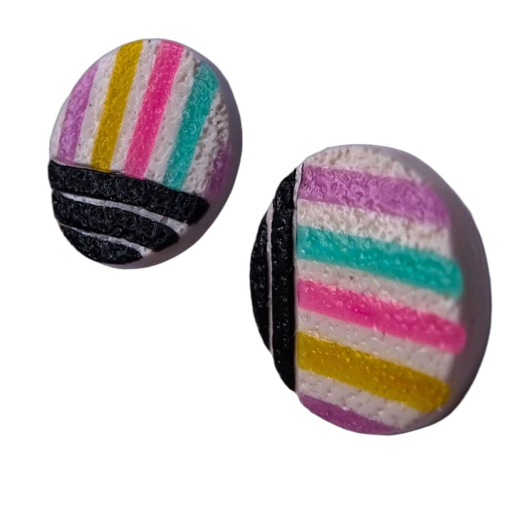 Bring a splash of playful colour and modern charm to your look with these handcrafted polymer clay stud earrings! Featuring cheerful hand-formed stripes in soft pastel tones of pink, mint, yellow, and white, accented with a bold touch of black for contrast — these earrings are little circles of joy you’ll love to wear.