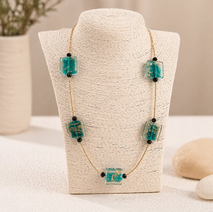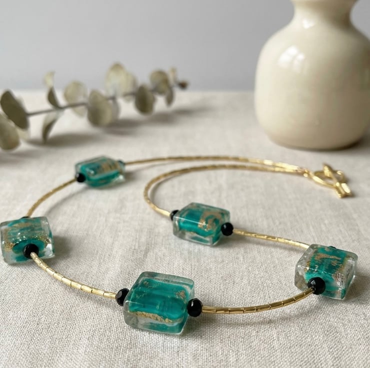 Made with beautiful vintage genuine Murano glass beads in a dark Jade green with gold flecks, I have added black faceted beads to contrast, the gold that is mixed into each bead catches the light perfectly, the necklace is strung on strong flexible 49 strand wire and i have threaded 5mm gold glass tube beads as spacers this is a one off design so you will be getting something very unique, the clasp is a gold plated heart and cupids arrow toggle clasp, measuring 21inches its a real statement piece. Will be carefully gift wrapped before posting.