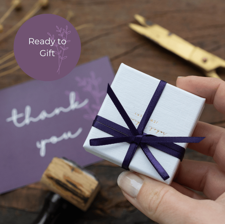 My jewellery is lovingly packaged to create that special unboxing experience whilst being mindful of my impact on the environment. It is presented in a gift box tied with ribbon, all enclosed in tissue with sprigs of dried lavender from my garden. I use eco-friendly paper tape for all my parcels too!
