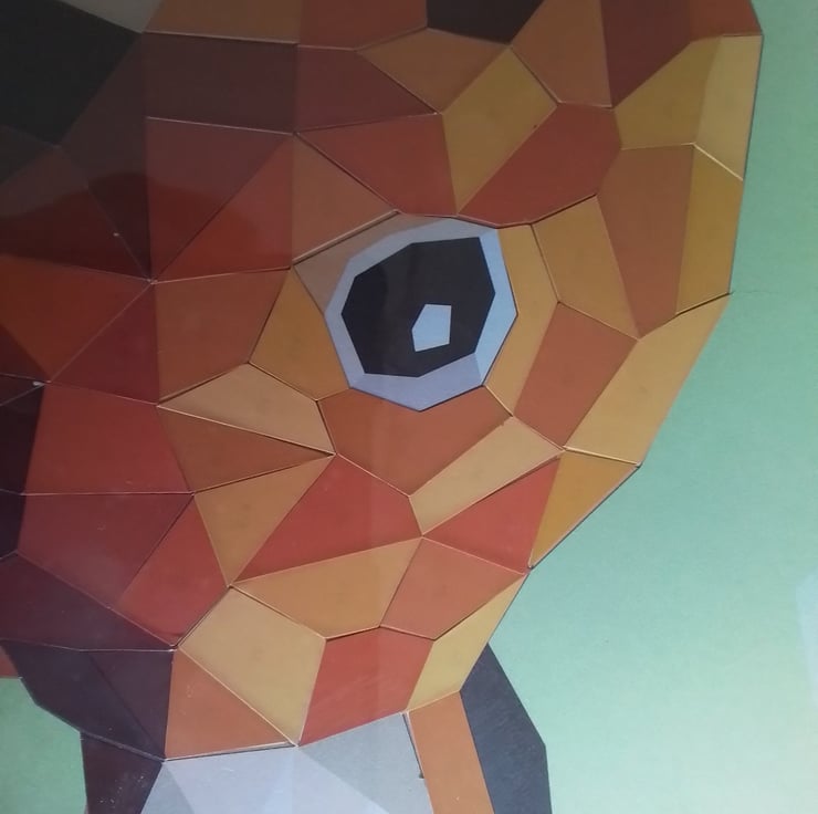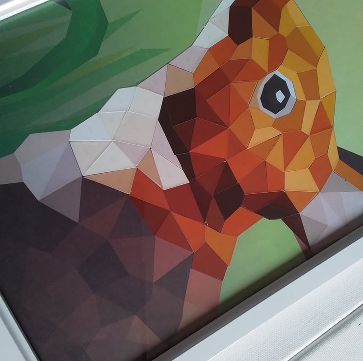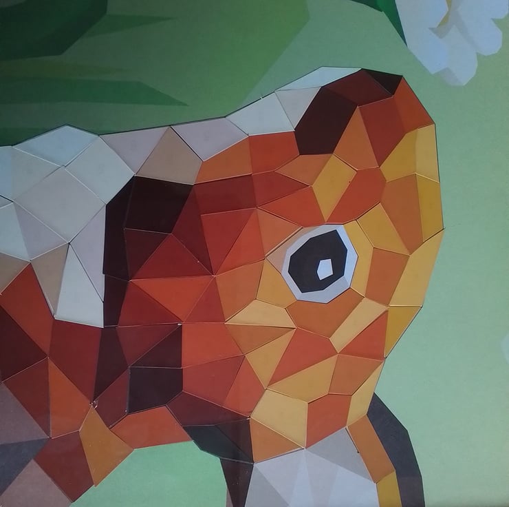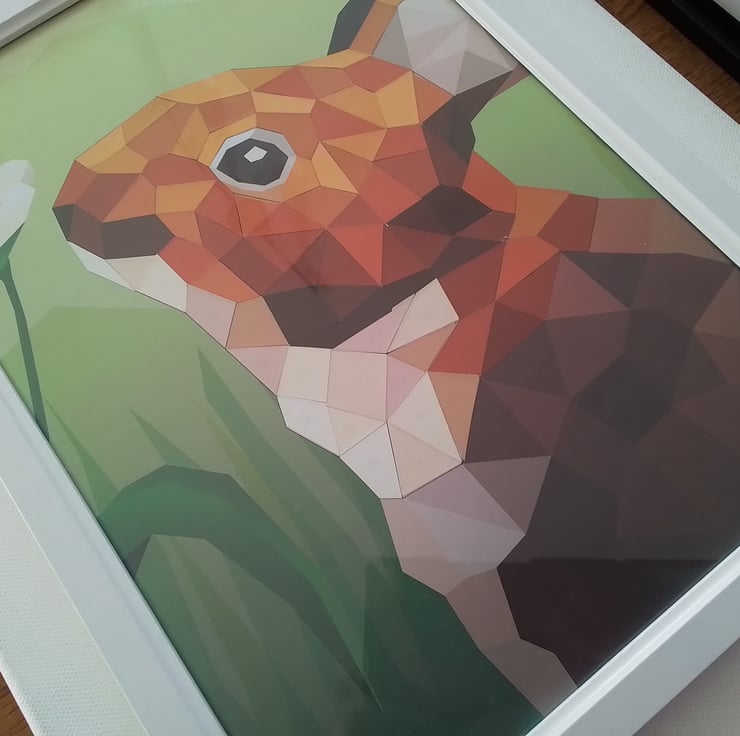 An A4 papercut rabbi picture made using pre cut paper mosaic shapesthe rabbit is sniffing at a flower. Framed in a white edged frame.