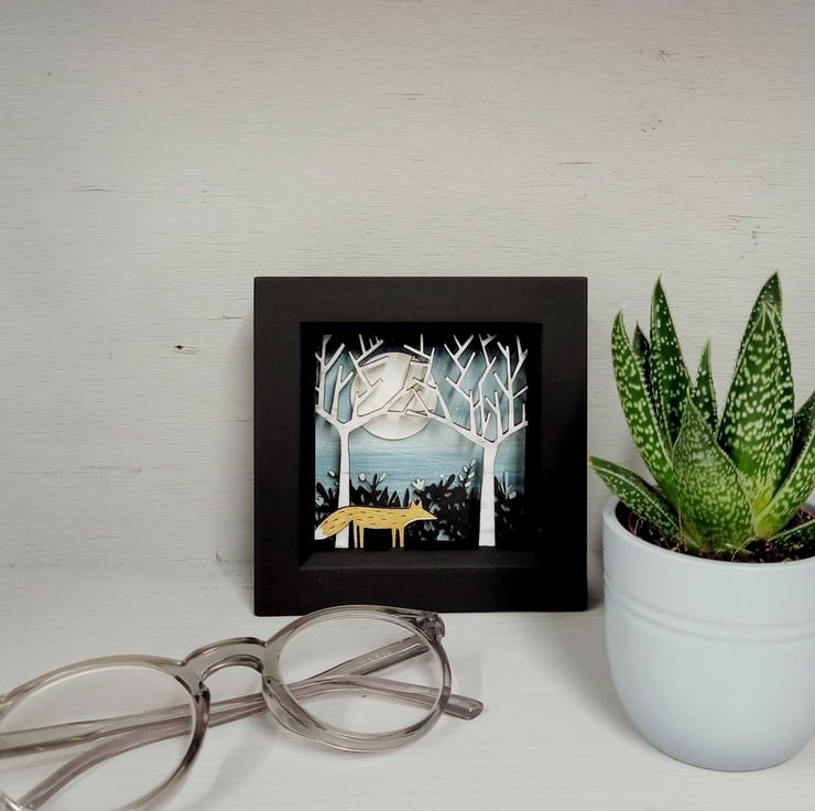 'Golden Fox' - this miniature diorama picture features a little golden fox roaming through a forest underneath a full moon; it is inspired by my love of animals, nature and specifically the foxes who live in the woods at the end of my road.