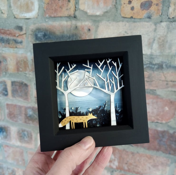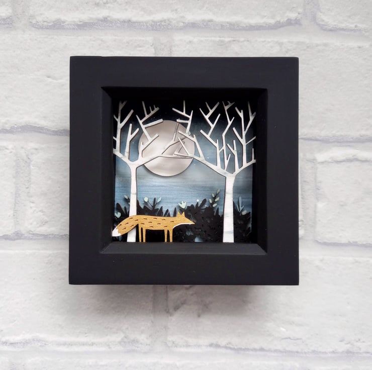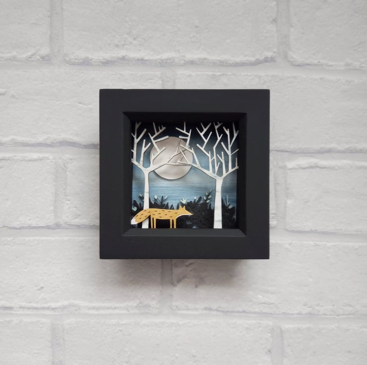 The design comes from original drawings which have been transformed into pieces of laser cut plywood and mount board. I then paint all the pieces by hand, assemble them to form 3d layers and set them into a glazed, black box frame, which measures approx. 11.5cm; the scene itself measures 7.7cm x 7.7cm x 1.5cm.